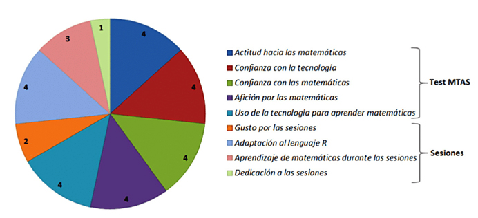 El test mtas, por tanto, mide la autopercepción de los alumnos sobre las cinco cuestiones mencionadas, las cuales involucran gusto y capacidad por las Matemáticas y la tecnología (Informática, básicamente) y su conjunción, en ciertos casos. Para ello, cada pregunta tiene asociada una respuesta en la escala 1-5, donde 1 indica totalmente en desacuerdo y 5 totalmente de acuerdo. Sin embargo, en el test que hicieron los alumnos que forman parte de este estudio se modificó la escala a una del tipo 1-6, con la intención de evitar respuestas neutras, que sí pueden darse en el test original (donde se asocian con el valor 3). Hicimos esta modificación para evitar un exceso de respuestas neutras, que podrían haber tenido como consecuencia una escasa variabilidad en los resultados de algunas de las preguntas en la muestra (33 alumnos) de la que se dispuso para el estudio. Por tanto, al haber elegido utilizar para la respuesta una escala 1-6, el valor central de la misma será 3,5 y servirá para conocer si la respuesta media de los alumnos ha sido positiva (>3,5) o negativa (<3,5) en cualquiera de las preguntas o categorías. De este manera se realizaron 10 preguntas sobre las propias sesiones correspondientes a varias categorías e incluyendo aspectos como el gusto de los alumnos por las sesiones o las dificultades experimentadas durante las mismas; en resumen, la encuesta utilizada para valorar el éxito de la metodología estuvo formado por 30 preguntas (Tabla 1) clasificadas por categorías (Figura 2).