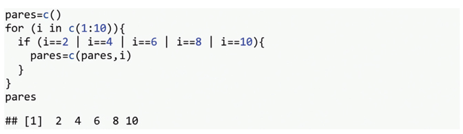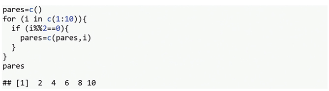 Si bien este bucle resuelve perfectamente el problema inicialmente planteado, es evidente que no resulta eficiente si se desea cambiar el número 10 por un número natural cualquiera, n, significativamente mayor. Para mejorar la resolución de este problema, los alumnos necesitaron revisar su idea de paridad y formalizarla debidamente a través del resto que se produce al dividir cualquier número natural entre 2, el cual solo puede ser 0 (número par) o 1 (número impar). De este modo, el bucle que finalmente implementaron fue el que aparece en la Figura 4, donde el símbolo %% representa el operador resto de una división entera en el lenguaje R.