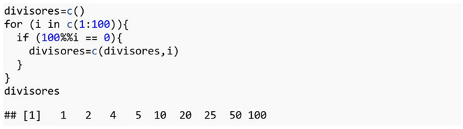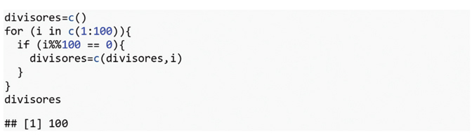 Sobre este mismo problema fue planteada la posibilidad de optimizar el proceso que se estaba implementando, reduciendo la cantidad de números intervinientes en el bucle. Por ser este asunto de mayor complejidad, se aconsejó a los alumnos que sustituyeran el valor de 100 (en i in c(1:100)) por números inferiores, para ver en qué medida el resultado se veía afectado. Tras varios intentos, algunos ya comenzaron a intuir que a partir de cierto valor límite no se producían cambios en cuanto a los divisores encontrados, develándose finalmente que solo era necesario ejecutar el proceso repetitivo hasta i = n / 2, es decir, hasta i = 50 para el caso del número 100. De esta forma, los estudiantes pudieron reforzar su conocimiento sobre los divisores de un número y apreciar la necesidad de reducir el coste de los programas siempre que sea posible.