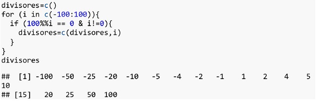 Una fácil modificación del código que genera los divisores de 100, para que también se almacenen los divisores negativos, puede apreciarse en la Figura 7.