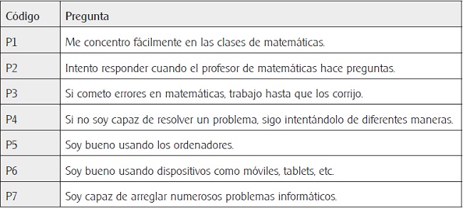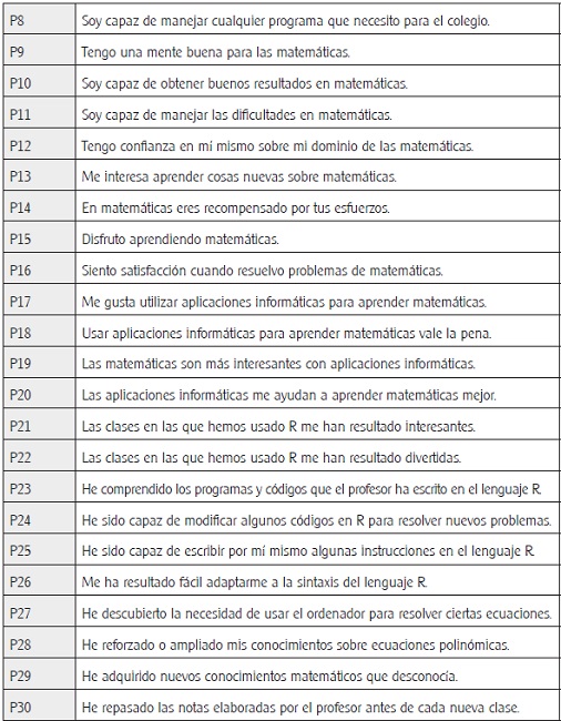 Con el fin de estudiar lo exitosa que resultó la metodología empleada, se pasó a los alumnos una encuesta con diversas preguntas en relación a las sesiones recibidas. Para medir con cierta precisión los efectos que sobre ellos tuvo la nueva metodología, las preguntas referentes a las sesiones fueron acompañadas de otras, totalmente generales, que valoraban su aptitud y actitud hacia las Matemáticas, la Informática y la combinación de ambas. Las preguntas que se hicieron al respecto son las que forman parte del test mtas (Mathematics and Technology Attitudes Scale) diseñado por Pierce et al. (2007). El test consta de 20 preguntas divididas en cinco categorías (cuatro preguntas para cada una) que podrían traducirse, a partir de su denominación original, de la forma siguiente: actitud hacia las matemáticas, confianza con la tecnología, confianza con las matemáticas, afición por las matemáticas y uso de la tecnología para aprender matemáticas.