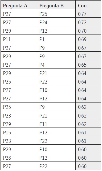 Es importante también analizar las fuertes relaciones que se hayan podido producir entre las respuestas de algunas de las preguntas del test mtas y las que trataban de forma particular sobre las sesiones que se han llevado a cabo, o incluso entre preguntas de estas últimas que pertenecen a categorías distintas (ver Tabla 2).