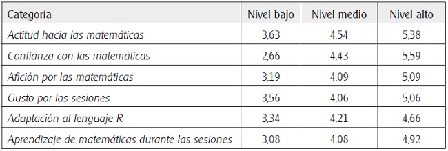 Aun siendo conscientes de las limitaciones existentes en esta separación de los estudiantes por niveles, y teniendo en cuenta que los tamaños muestrales dentro de cada nivel son muy reducidos, la Tabla 3 proporciona una idea para comprobar cómo se comportan los promedios en cada grupo y reafirma lo mencionado de que los alumnos especialmente inclinados hacia las matemáticas disfrutaron de las sesiones, pero los que presentan menor interés o mayores dificultades no reaccionaron de forma tan positiva. En cualquier caso, es muy destacable que el grupo clasificado como de nivel medio (el más numeroso) aceptara notablemente la metodología planteada.