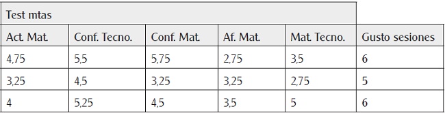En la Tabla 4 pueden verse las puntuaciones para el test mtas y para la variable gusto por las sesiones de tres estudiantes para los que el método resultó muy efectivo. Es especialmente interesante ver cómo la metodología fue positiva para los dos primeros alumnos de la tabla, a pesar de su poco afecto por las matemáticas y por el uso de la Informática para su estudio.