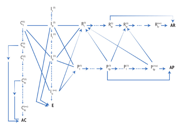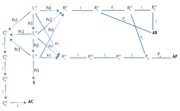 Es sobre la base de estas características que se elaboró un modelo cualitativo que toma la forma de un grafo G ponderado, donde los vértices representan los estados posibles (estado de inicio, estado de ejecución de procedimientos, estados finales de éxito, estado de abandono) y las aristas los posibles cambios de estado. Estas aristas estarán asignadas a probabilidades de transición luego de la cuantificación del modelo. En este modelo, el tiempo está gestionado por un contador discreto, cada procedimiento Qi está asignado a un tiempo de ejecución ti, y a una tasa de repeticiones permitidas mi. El grafo G correspondiente (esquema 2 en el artículo), sin ponderaciones, es reproducido en la figura 1, donde AC, AR y AP representan un estado final de éxito en relación con los procedimientos C, R y P, y E el estado de abandono.