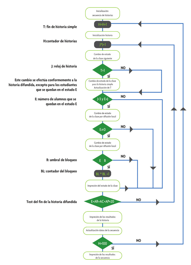 Para los modelos sin difusión o con difusión local por equipos de 2, los cálculos relativamente simples de probabilidades han permitido determinar los estados finales de clase y las probabilidades en términos de vecindades, así como la duración de las historias de clase. Pero, para el estudio de otros modelos, esto resultaba muy complejo, por lo que se recurrió a simulaciones informáticas utilizando un método de Montecarlo para simular las transiciones de estado. El organigrama del programa de simulación aparece en el anexo. Para cada caso, se han realizado 2 series de 100 simulaciones de historias de clase con 20 alumnos, no obstante, se han hecho paralelamente los cálculos para el modelo sin difusión asociada, llamado aquí de la historia simple asociada. Finalmente, para cada simulación, el programa provee: