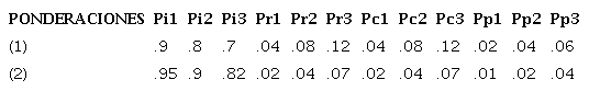 Es posible apreciar que, a pesar de que en esta modelización intervienen un gran número de parámetros, no es sino una drástica simplificación de la realidad de la clase. Por otra parte, los datos obtenidos permiten considerar solamente intervalos de valor razonable para estos parámetros. La modelización conduce por lo tanto a una infinidad de modelos cuantitativos que en la investigación exploran. Esta exploración privilegia tres variables consideradas clave por la dinámica de la situación en vista de las observaciones realizadas: la probabilidad de abandono, el tamaño de los equipos y el coeficiente de difusión local. De hecho, 16 cuantificaciones del modelo van a ser exploradas correspondientes a dos probabilidades de abandono (vecinas de 0.5 y 0.7), dos tamaños de equipos (2 y 4 estudiantes) y 4 valores del coeficiente de difusión global (0, 0.25, 0.5 y 1). El grafo ponderado asociado es el grafo G’ que se reproduce a continuación (ver figura 2), en el cual las aristas tienen las ponderaciones de la tabla 1. Este grafo es una versión simplificada del grafo G, los tiempos de ejecución y la tasa de repetición admitida para cada procedimiento son fijos (por ejemplo, de valor 1 y 4 respectivamente para el procedimiento I) así como las probabilidades de transición entre procedimientos.