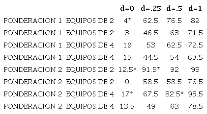 Tratándose de los estados finales y de su distribución, la simulación de las historias simples muestra que sus estados finales siguen una ley multinomial con cuatro parámetros, y cada uno de sus componentes una ley binomial. Pero con la introducción de la difusión, las distribuciones se alejan sensiblemente de este modelo, la diferencia aumenta cuando el coeficiente de difusión crece, como podía esperarse. En todos los casos, las diferencias observadas son estadísticamente significativas. Las regularidades observadas en este nivel me llevaron a introducir la noción de historia con estado dominante, definida como una historia en la cual uno de los componentes del estado final reagrupa más del 70% de los alumnos. Desde que la difusión ya no es simplemente local, estas historias se convierten en mayoría, como lo muestra la tabla 2 que aparece a continuación y que corresponde a la tabla 10 del artículo. En esta tabla, arriba de la diagonal aparecen los porcentajes globales y abajo los porcentajes de historias con un estado final dominante AR. El asterisco indica la existencia de historias con un estado final E dominante. Como lo muestra esta tabla, y en coherencia con lo que ha sido mencionado, para los abandonos, la variable ponderación de los abandonos tiene mayor influencia que la variable tamaño de los equipos.