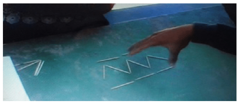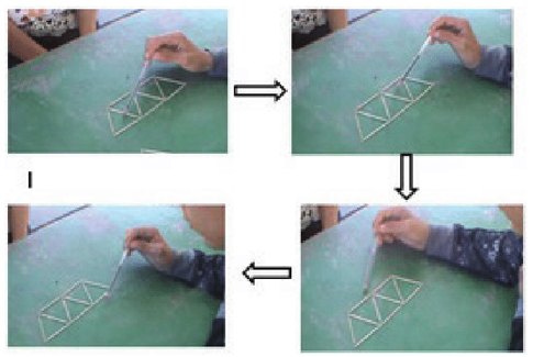 Para esta tercera sesión y con los antecedentes de la primacía de la estrategia de generalización DfMA, decidimos continuar con la sucesión de términos ocultos, pues se conjeturó que esta forma de presentar la sucesión limitaría el uso de estrategias recursivas o aritméticas (Samson, 2012). Además de la incorporación de la variable tarea, se planteó valorar el impacto de la manipulación de objetos concretos (palillos de madera) como estrategia visual encaminada a inducir la regla. De este proceso el estudiante daría cuenta ya no de casos concretos (contexto), sino que sería capaz de describir y extender la estructura general de la sucesión. En consecuencia, una vez inducido un patrón de regularidad, el alumno tendría la posibilidad de expresar el término general. La sesión que se reporta tuvo una duración de 50 minutos.