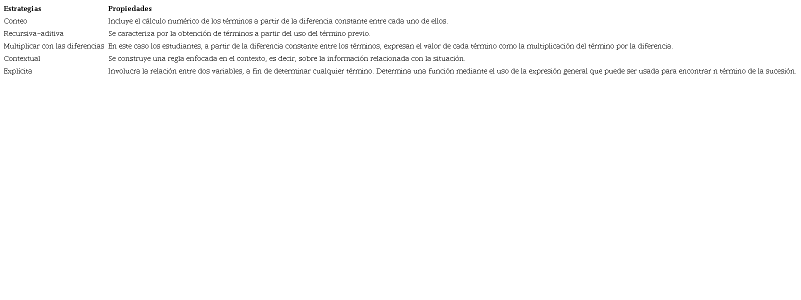 En la Educación Matemática, las estrategias se definen como las formas de actuación o ejecución de tareas, dentro de una estructura que supone cualquier tipo de procedimiento que pueda efectuar, teniendo en cuenta las relaciones y los conceptos implicados. Gümer, Ersoy y Témiz (2013) sintetizan los modos de actuación de los sujetos ante la tarea de generalización en sucesiones de tipo figural y reportan las siguientes estrategias, presentadas en la Tabla 1.