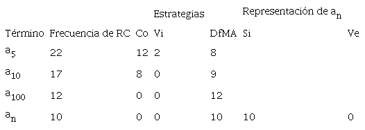 En la segunda columna se observa que las frecuencias de RC disminuyen conforme se incrementa la posición del término solicitado. En la actividad de obtener la expresión de an 35% de los estudiantes lograron resolver correctamente la actividad. La estrategia utilizada en la totalidad de estos casos de RC fue la de diferencias con factor multiplicativo y ajuste. Se destaca también la preponderancia de la regla simbólica como la forma de representar el término an .