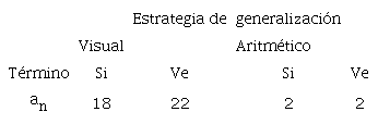 Por último, al comparar las Tablas 2 y 3 observamos que el uso de material concreto, al igual que el trabajo con sucesiones con términos ocultos, favoreció que los alumnos recurrieran a la estrategia visual como medio de generalización. Se logró que 73% de los participantes en la fase de intervención recurrieran a la estrategia visual como modo de generalización; de ellos, 68% estableció un patrón válido de crecimiento y pudo representarlo mediante una regla verbal. Cualitativamente, la estrategia visual permitió que los estudiantes centraran su razonamiento en establecer nociones generales de variabilidad a partir del análisis de los términos en sucesión, en tanto que la actividad sobre patrones de figuras no se limitó a efectuar solamente cálculos aritméticos encaminados a la obtención de un valor numérico como respuesta.