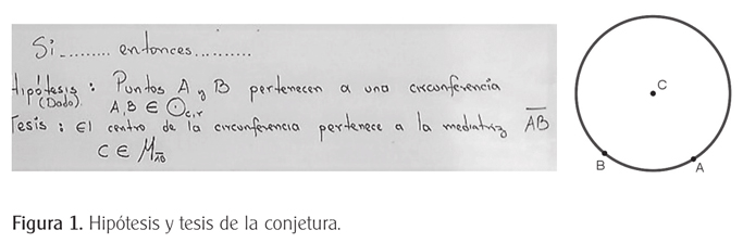 P1 escribe en el tablero “si…entonces…” y dice que, con relación a la conjetura, como ya es usual, se deben precisar dos “cosas” importantes: su hipótesis y tesis. Da tiempo para que los alumnos digan a qué se hace referencia cuando se habla de hipótesis en una demostración. Un estudiante expresa que a lo “dado”. P1 pregunta qué sería lo “dado” en el enunciado de la conjetura, y “aquello a lo que se quiere llegar”. Otro estudiante (E2) responde las preguntas, a la vez que P1 escribe lo “dado” frente a la palabra “hipótesis” y “aquello a lo que se quiere llegar” frente de la palabra “tesis” (Figura 1). P1 reescribe, con notación geométrica, tanto la hipótesis como la tesis. Finalmente, en el tablero queda escrito lo siguiente: