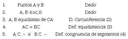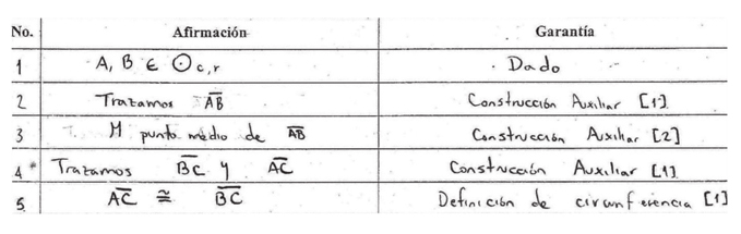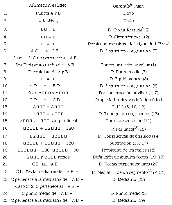 A fin de precisar otros discursos reflexivos que se esperan de los estudiantes, detallamos a continuación tipos de discursos que se corresponden con las diferentes maneras en que se puede presentar una demostración para comunicarla: (i) Es posible comunicar una demostración de manera tal que solo exponga los pasos estructurales (estructura modular)7 que la componen -en adelante, pasos estructurales de Nivel 1-; y (ii) Al comunicar una demostración se presenta un encadenamiento fino de todas las aserciones (no solamente las estructurales), explicitando las garantías de cada aserción y los datos empleados para usar tales garantías; en otras palabras, se desarrolla con cierto detalle la estructura modular de la demostración -en adelante, pasos de Nivel 2- (Mejia-Ramos, Fuller, Weber, Rhoads & Samkoff, 2012). Samper y Plazas (2017) aluden a formatos especiales para presentar una demostración, que se corresponden con esta clasificación: por un lado, usan el formato Núcleos-Pilares, mediante el cual se presentan demostraciones que exponen sus pasos estructurales (de Nivel 1), siendo los Núcleos las respectivas aserciones y los prilares las garantías correspondientes; por otro lado, aluden al formato Afirmación-Garantía para presentar demostraciones de Nivel 2. Con el propósito de ilustrar la diferencia entre estos dos tipos de discursos, consideremos como ejemplo una demostración del siguiente enunciado: Si los puntos A y B pertenecen a una circunferencia, entonces el centro de la circunferencia pertenece a la mediatriz de . La Tabla 1 presenta una demostración con el encadenamiento fino de todos los pasos (argumentos) que la componen (Afirmación-Garantía); están sombreadas las celdas de los pasos que componen la estructura modular de la demostración (Núcleos-Pilares).