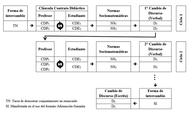 El dispositivo analítico, para el caso del curso de secundaria, permitió tener evidencias para identificar que, en el marco de la Tarea Nueva Construir colectivamente una demostración, el uso continuo (y cíclico) de cláusulas del contrato didáctico por parte del profesor (e.g., hacer preguntas de indagación -CDP1-, y orientar y redireccionar las producciones de los alumnos -CDP3--), junto con las respectivas respuestas por parte de los estudiantes en cumplimiento de su parte contractual (e.g., argumentar afirmaciones -CDE1-, y participar en clase -CDE2 y CDE3-), llevan a instaurar normas sociomatemáticas como toda afirmación se argumenta con base en el sistema teórico (NS1) y una demostración es una cadena deductiva (NS2).