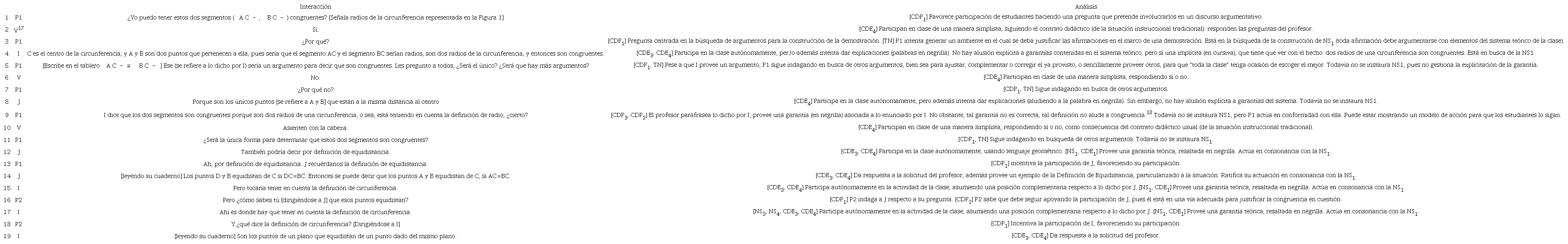 Un aspecto relevante es que, si bien esta fue una actividad autónoma por parte de los estudiantes, hay una acción del profesor, quien está implícitamente presente e induce al uso de los discursos D1 y D 2 (no necesariamente válidos): el formato para elaborar la demostración alude a las columnas Afirmación y Garantía (relativa a D1), y a la necesidad de hacer varios pasos encadenados (relativo a D2) producto de la aparición de varias filas. Esta acción del docente está en el terreno de una forma de intercambio de tipo situación instruccional (SI), puesto que se reitera implícitamente la cláusula CDP1 y la necesidad de cumplir con NS1 y NS2.