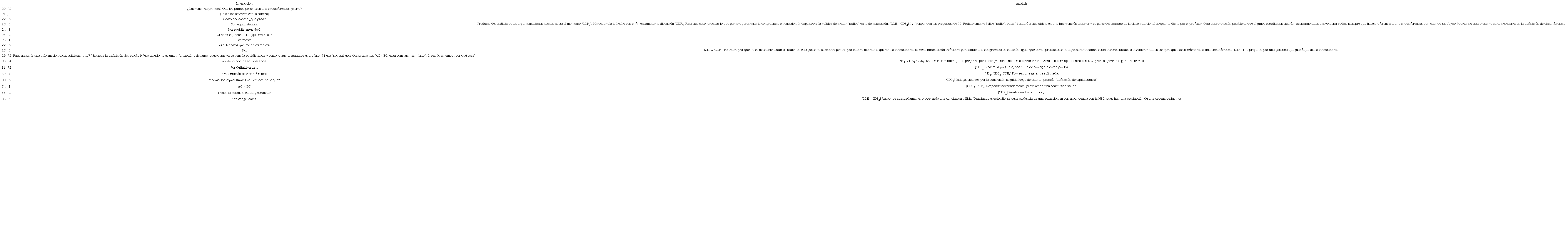 Por motivos de espacio, en este artículo se presenta la descripción de los momentos 2, 3 y 9, así como el análisis de los momentos 3 y 9. Vale decir que el momento 3 fue el más rico en la interacción del aula, el de mayor duración y el que proporcionó la información más relevante, junto con el momento 9. En las descripciones y análisis se destaca con I y J a los estudiantes que más participaron en la interacción, debido a que nos interesó comparar su actuación durante la interacción colectiva con su producción individual posterior, cuando escriben la demostración. Para sistematizar el análisis usamos los códigos escritos en negrita en la Tabla 2.