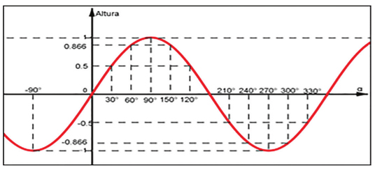Luego se representarán en el pizarrón los valores de seno calculados y se extenderá lo obtenido a valores mayores a 180° y negativos. Se espera mediante la puesta en común llegar a la siguiente representación gráfica: