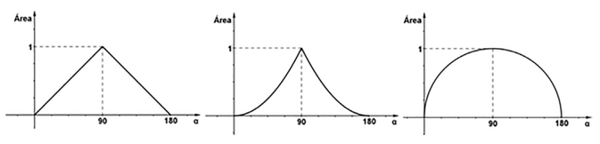 Se espera que los estudiantes reconozcan al menos tres puntos. El máximo es 1 para 90° y el mínimo es 0 para 0° y 180°. Ante esto los estudiantes pueden sugerir diversos gráficos, como, a modo de ejemplo, los siguientes: