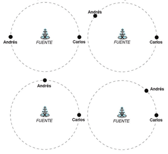 Discute en tu grupo las diferentes posiciones en las que pueden estar Andrés, Carlos y la fuente (ejemplificando con dibujos).