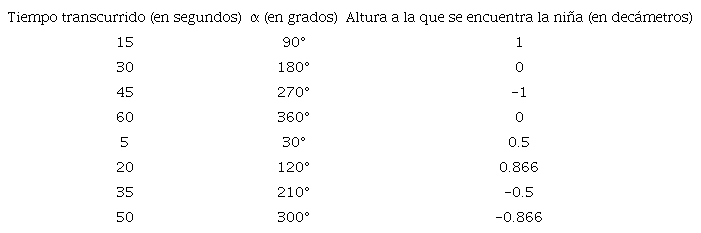 Y si el ángulo de giro fuera negativo, es decir si gira para el otro lado, ¿a qué altura de la plataforma se encontrará la niña al minuto de comenzado el juego? ¿y a los treinta segundos?