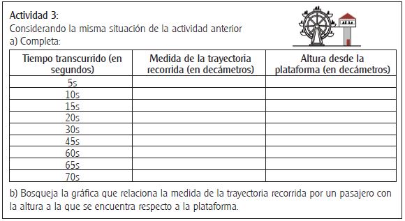 De acuerdo a estas investigaciones, se destaca la importancia de que las actividades estén orientadas a la construcción de la función trigonométrica a partir del estudio de la variación y el cambio, con el objetivo de utilizar y resignificar la periodicidad y la acotación de esta función por medio de problemas contextualizados, en particular poniendo a los estudiantes en la situación de predecir posiciones futuras de un objeto que se mueve. Es esa la práctica social que norma la construcción del concepto de función trigonométrica.