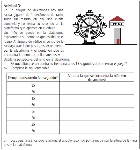 Durante la realización de las primeras partes de la actividad, los estudiantes podrán utilizar los conceptos previos que poseen, y darle un nuevo significado al seno del ángulo, ya que lo utilizarán como herramienta para calcular la altura de la niña respecto a la plataforma.