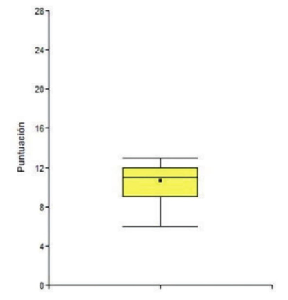 La puntuación máxima posible en esta evaluación es de 28 puntos. La media ha sido de 10.63; mediana, 11; cuartil inferior, 9.5; cuartil superior, 12; desviación típica, 1.82; mínimo 6 y máximo 13. Con base en estos datos, podemos afirmar que la tarea ha resultado difícil para los estudiantes.