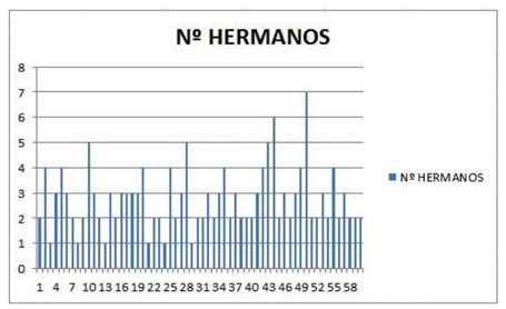 Algunos errores manifestados fueron el uso de la moda (valor especialmente indicado para variables cualitativas) y la aproximación de la media (2.75) a dos o tres hermanos. Este valor o el de la mediana (2.68), si hubiera sido aplicado, no tienen por qué coincidir con el valor que toma la variable en un sujeto particular. Finalmente, en la construcción de gráficos, un error que llama la atención es su construcción sin hacer un “resumen estadístico” de los datos (figura 2). En este caso se grafican los valores de la variable de acuerdo a la matriz de datos, en lugar de las frecuencias asociadas a cada valor. Al respecto Batanero, Arteaga y Ruiz (2010) definen cuatro niveles de complejidad semiótica en la construcción de los gráficos estadísticos por parte de futuros profesores de educación primaria; las representaciones como la mostrada en el Figura 1 corresponderían al segundo nivel, en el cual se representan todos los datos en el orden como fueron recogidos, sin llegar a formar una distribución de frecuencias. Los autores muestran que este tipo de representaciones dificulta la lectura e interpretación de los datos mostrados en los gráficos. Los autores recomiendan trabajar con gráficos de niveles de complejidad semiótica 3 o 4, en los que los futuros profesores ya llegan a la distribución de frecuencias de las variables estadísticas representadas.
