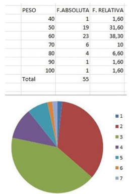 Algunos errores manifestados fueron la determinación del alumno típico a partir del rango de mayor frecuencia absoluta (cálculo incorrecto de la moda) y la aproximación de la media (61.45) a 61 o 62 kg. En la construcción de gráficos, además de algunos grupos que no hicieron un resumen estadístico de los datos (uso de tablas de frecuencias), está presente la dificultad de reconocer el tipo de gráfico más apropiado para responder la pregunta. La figura 3 muestra la producción de uno de los grupos que optó por la construcción de un gráfico circular, el cual no permite visualizar la forma de la distribución ni distinguir la presencia de sujetos atípicos.