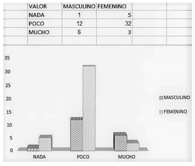 Algunos errores manifestados en esta variable fueron la comparación de las dos submuestras (hombres y mujeres) mediante un gráfico de frecuencias absolutas (figura 4) y la comparación a través de la moda. Esto último conlleva a no reconocer las diferencias, ya que la moda es la misma en ambos grupos (poco deporte).