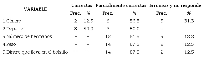 La tabla 3 presenta los resultados de las respuestas dadas a este ítem para las últimas cuatro variables estadísticas (en la variable género no es aplicable esta pregunta), distinguiendo las respuestas correctas, parcialmente correctas y erróneas (y en blanco).