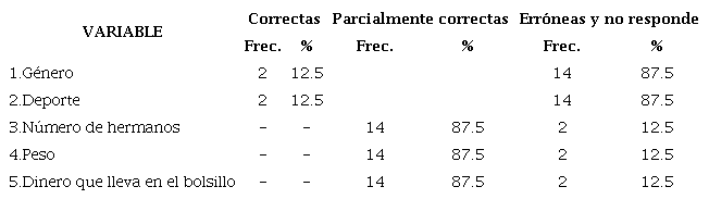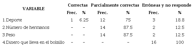 En la tabla 1 presentamos los resultados para cada variable estadística, distinguiendo las respuestas correctas, parcialmente correctas y erróneas (y en blanco).