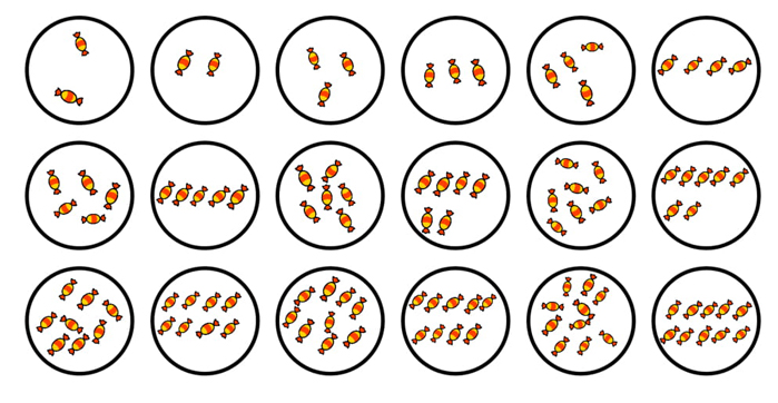 Para evaluar la enumeración de colecciones y el conteo con cardinalidad se diseñó una actividad que llamamos “¿Cuántos son?”, en la que se usaron 18 platos de cartón a los que se les adhirieron dulces. Los platos tuvieron entre dos y diez dulces. En la mitad de los platos, los dulces estuvieron alineados y en la otra mitad no (ver Figura 1).