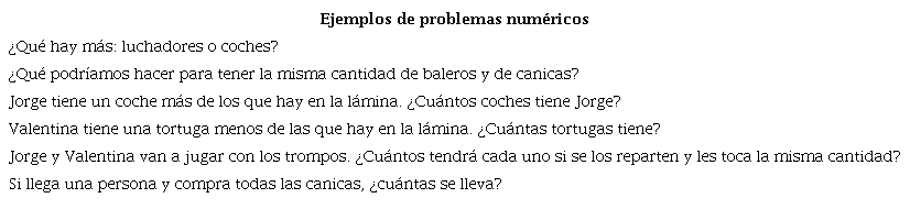 Para segundo grado (niños de tres y cuatro años), se espera que los estudiantes trabajen con colecciones de hasta ocho elementos, además de que resuelvan problemas que implican establecer diferentes tipos de relaciones cuantitativas. Por ejemplo, una de las láminas del álbum contiene el dibujo de un tapete en el que se encuentran desordenadamente distribuidos 47 juguetes, de doce diferentes tipos: banderines (7), canicas (6), capas de luchador (6), tortugas (5), luchadores (4), matatenas (4), coches (4), trompos (4), yoyos (3), baleros (2), camioneta (1) y cuerda para trompo (1). El Libro de la educadora propone aprovechar la lámina para presentar problemas que implican comparar, igualar, agregar, quitar, repartir, y reunir. En la Tabla 1 se muestra un ejemplo de cada uno.