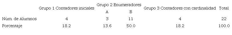 Con base en su desempeño, se identificaron tres grupos de alumnos. El de mejor desempeño (Grupo 3; ver Tabla 2) estuvo conformado por cuatro alumnos, dos niños y dos niñas, que parecieron haber desarrollado las habilidades necesarias para contar colecciones de al menos diez elementos con cardinalidad.