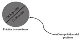 En la figura 2 se ilustran los tipos de conexión y los procesos de participación y cosificación en la práctica de enseñanza y su relación con las otras prácticas mencionadas en uno de los extremos de la flecha de la figura 1. De esta forma, la figura 2 es una continuación de la figura 1.
