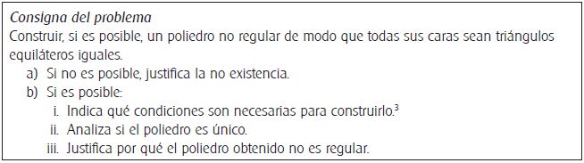 El problema presentado forma parte de una secuencia didáctica que tiene como objetivo resignificar la definición de poliedro regular a partir de la construcción de poliedros no regulares que cumplan sólo algunas de las condiciones exigidas por la definición, con el uso de software de geometría dinámica. Esta secuencia forma parte de un trabajo de investigación más amplio que tiene como objetivo analizar si los estudiantes tienen construido el concepto figural de poliedro.