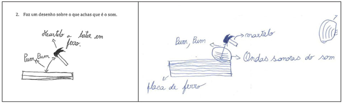 Nas visitas dos formadores às aulas dos formandos para exemplificar as atividades, as sessões decorrem recorrendo ao questionamento investigativo, inquirindo os alunos sobre os conceitos em estudo, valorizando as experiências e conhecimentos individuais dos mesmos, levando-os a realizar e visualizar experiências, de modo a que consigam tirar conclusões. Para aferir sobre os conhecimentos dos alunos sobre o som, é realizado um questionário antes e depois da sessão destinada a este tema. Com este questionário, pretende-se por um lado identificar as perceções dos alunos sobre o som e, por outro, aferir se estas se alteraram após a sessão sobre o som. Até à escrita deste artigo o ques-tionário já foi aplicado a mais de uma centena de alunos, distribuídos por várias turmas, dos 3.º e 4.º anos, do 1.º CEB. A figura 1 apresenta um exemplo de respostas, de um aluno, à questão n.º 2: “Faz um desenho sobre o que achas que é o som”.