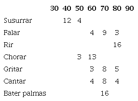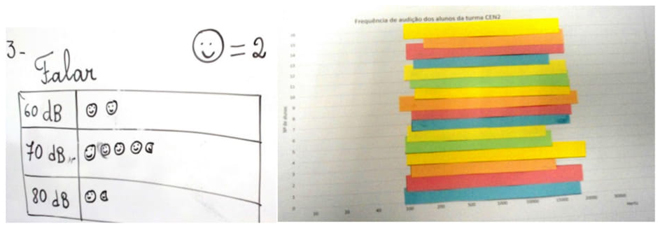 Com os registos obtidos, a partir das medições realizadas com cada um dos alunos, foram construídos gráficos (Figura 7). No primeiro, cada “cara” representa dois alunos que registaram aquela intensidade de som (em decibéis) enquanto fala-vam. No segundo, estão representadas as frequências de audição dos alunos (em hertz) no eixo horizontal e o número de alunos no eixo vertical, correspondendo cada retângulo colorido às frequências de audição de cada um dos alunos.