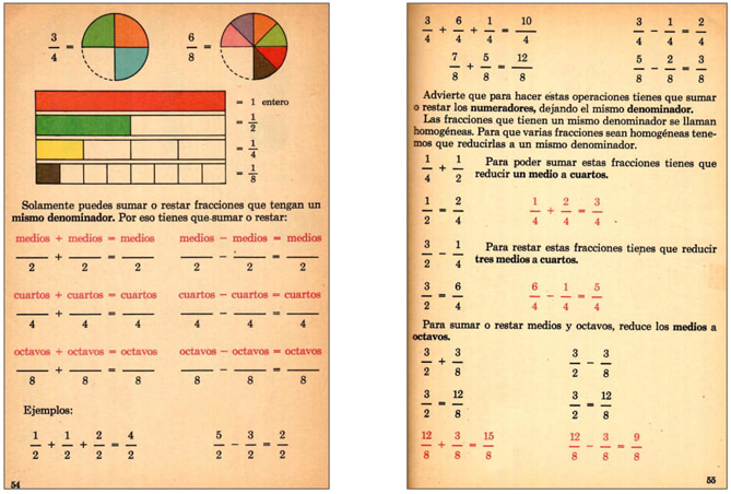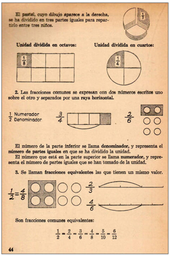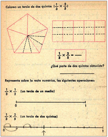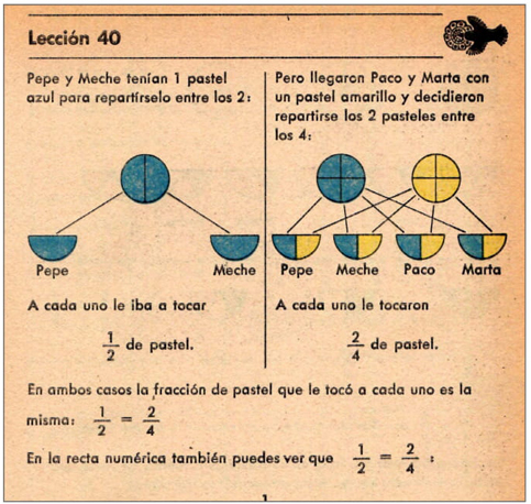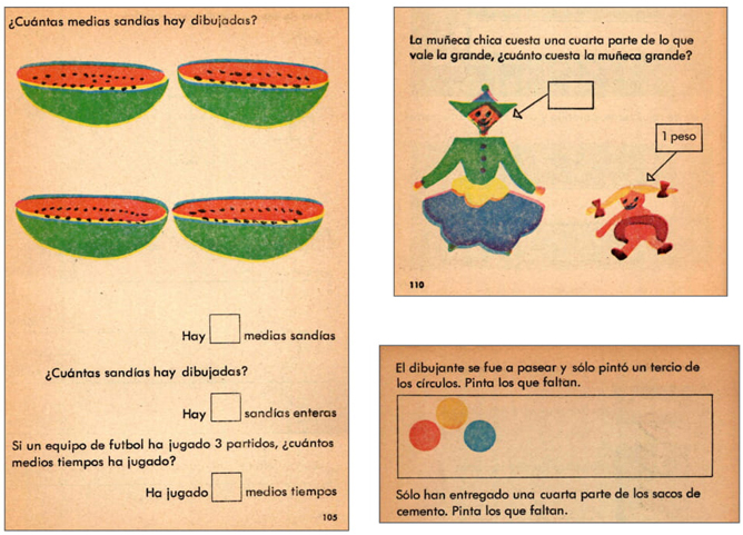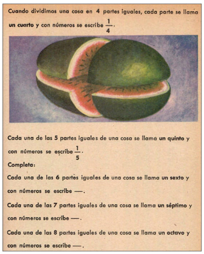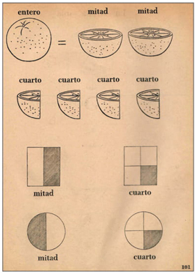 A lo largo de la primaria, es permanente y casi exclusiva la referencia a dicho modelo. Los “quebrados” se introducen en vinculación con el conocimiento etnomatemático mediante imágenes que ilustran partición de frutas con forma más o menos regular: naranjas, melones o manzanas. Esta idea permanece a lo largo de la primaria, pero las frutas son sustituidas paulatinamente por figuras geométricas y, al final, sólo quedan los símbolos y el lenguaje técnico-simbólico pues, según las recomendaciones de la época “la enseñanza de la aritmética debe ir de lo concreto a lo abstracto” (SEP, 1968).
