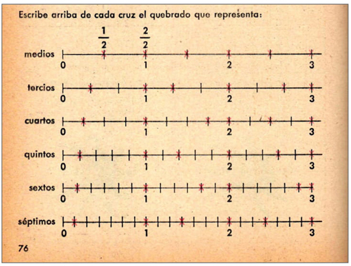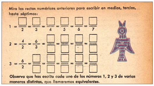Hoy este acercamiento resulta del todo cuestionable puesto que, además de que el modelo parte-todo determinaba el sentido y el límite de las fracciones, se consideraba que una presentación inicial (ostensiva) del conocimiento etnomatemático bastaría para que el conocimiento técnico-simbólico se impregnara de significado. No podía ser de otro modo. En ese entonces, la ostensión constituía el horizonte de la acción didáctica en Aritmética y geometría: el conocimiento entraba por los sentidos, y se generaba mediante intuiciones creadas a partir de las imágenes. Tal forma de concebir las fracciones y promover su enseñanza se vería modificada con el ingreso de la reforma de los años 70.