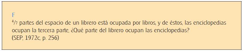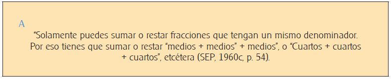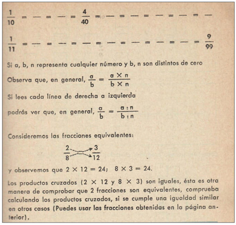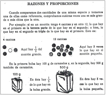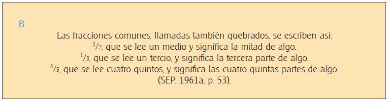 Tal formalización evoca la relación parte-todo y se complementa después con otra incluida en el libro de sexto grado (SEP,1970, p. 43), donde la referencia es a la idea de medida: