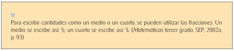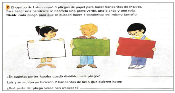 Pero la noción no se limita a lo anterior; en tercer grado se incorpora la idea de fracción como resultado de un reparto (tendiente a la idea de cociente) mediante el planteamiento de problemas del tipo siguiente: