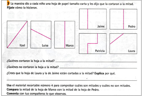 El acercamiento didáctico en esta propuesta es muy distinto de los anteriores; las frutas y las figuras geométricas desaparecieron como recursos para introducir las fracciones. Las lecciones sobre el tema (que comienzan en tercer grado) incluyen situaciones problemáticas a partir de las cuales -aprovechando los conocimientos previos de los niños- se van construyendo las nociones. El acercamiento inicia con las fracciones un medio y un cuarto, que durante un tiempo no serán nombradas formalmente ni simbolizadas. La figura 14 muestra un fragmento de una lección donde la intención es que se fraccionen hojas de papel en medios y cuartos sin utilizar necesariamente los términos.