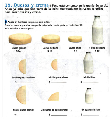 También es clara la intención de romper el esquematismo del modelo parte-todo presentando particiones no convencionales (figura 15), y vinculando las fracciones con cantidades discretas (precios) y continuas (litros o quesos) (figura 16).
