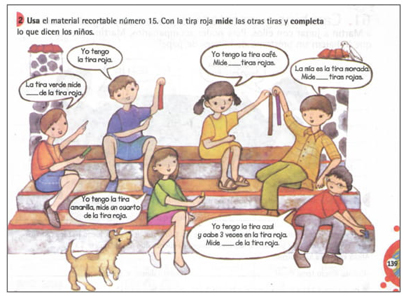 También se incluyen situaciones donde aparecen las fracciones en contexto de medición, con referencia a unidades no convencionales. Por ejemplo, unas tiras de papel se convierten en unidades de medida y de su uso resultarán fracciones (figura 17):