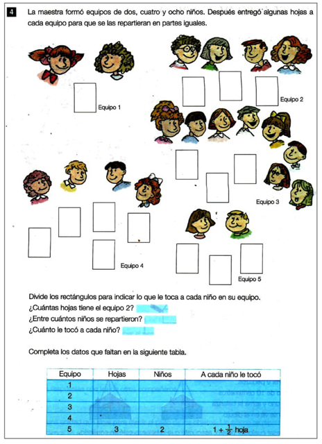 Cuando se incluyen las fracciones como resultado de un reparto, de manera distinta a como se hacía en la propuesta de 1972, los repartos se representan gráficamente, o se pide a los alumnos realizarlos con objetos o dibujos. La página donde se inicia el trabajo con esta interpretación se ve en la figura 18. La página es interesante porque, además de que los repartos se hacen efectivamente, la acción se vincula con la escritura de las fracciones (3 hojas para 4 niños; las 3 hojas se dividen para repartirlas entre los 4 niños; a cada niño le tocan 3/4 de hoja). Esta vinculación (CE-CI-CTS) también muestra el interés por el significado: aquí de una representación difícil de comprender (la de la forma a/b).