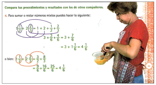 El currículo incluye también la suma de fracciones, que inicia en el tercer grado. En éste se utilizan fracciones de denominador 2 o 4 y a lo largo de todo el ciclo educativo se trabaja con fracciones fácilmente manejables. Se espera que los niños, con sus conocimientos etnomatemáticos y los intuitivos desarrollados en la escuela, desplieguen estrategias personales para calcular. Es por ello que, en vez de comunicarse algún procedimiento formal, lo más frecuente es que se comparen las estrategias de solución y los resultados con los de otros compañeros. Es hasta el final de la secuencia, en el sexto grado, donde se expone un ejemplo (no del todo desarrollado) de cómo podrían haber sumado los números mixtos implicados en la resolución de un problema (figura 19) (SEP, 2001, p. 55).