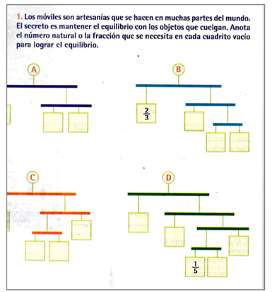 Este tema (la suma de fracciones) culmina en combinación con la idea de equivalencia, mediante una actividad consistente en anotar las fracciones convenientes para lograr el equilibrio entre diversos móviles (figura 20):